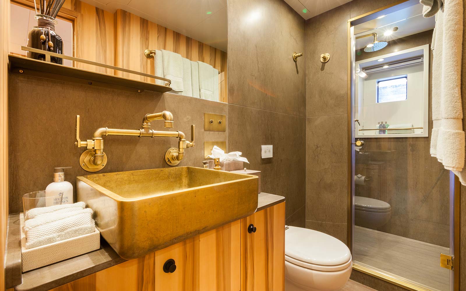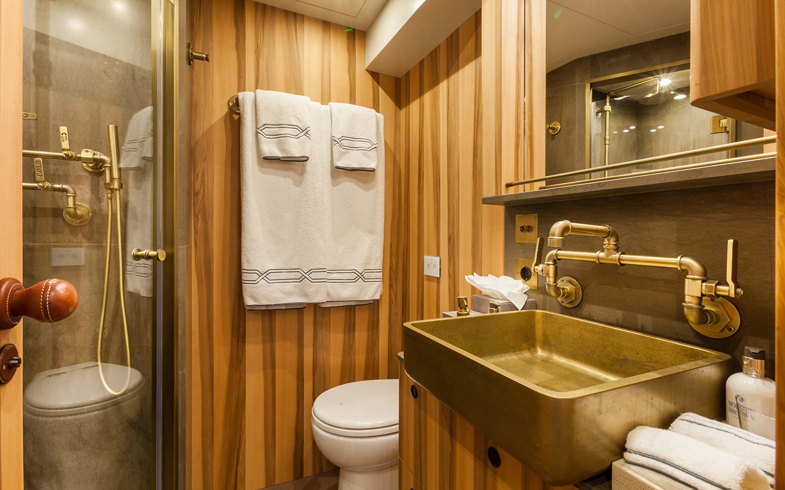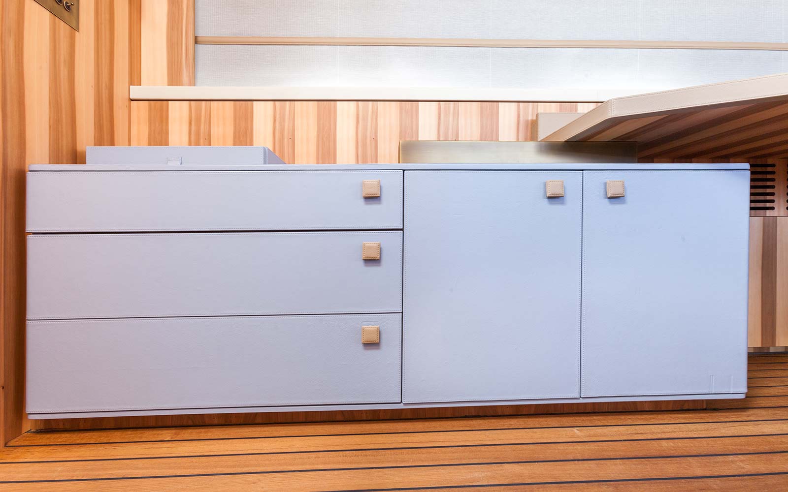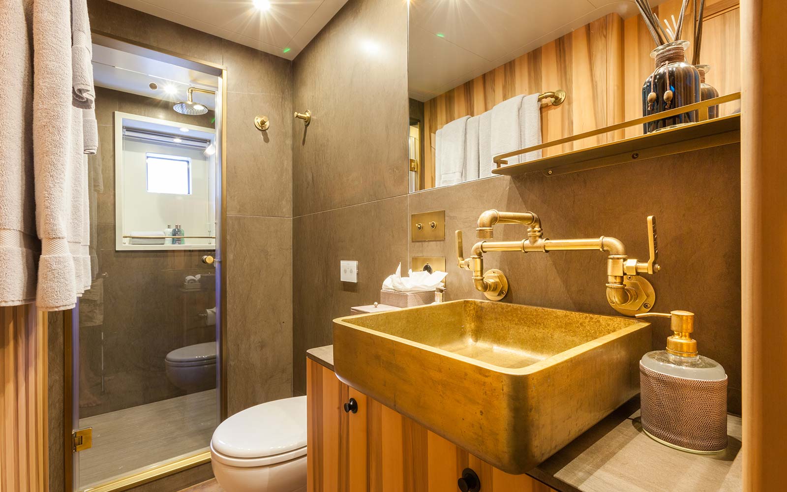 The interiors are designed by the Archistar Simon Hamui, able to give an Explorer twist to salons and cabins thanks to a wise blend of liquidambar timber, hand-stitched leathers drawers and cabinets resembling vintage Louis Vuitton travel bags, antique brass Waterworks faucets and an elegant choice of free-standing furniture.