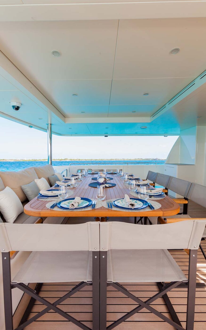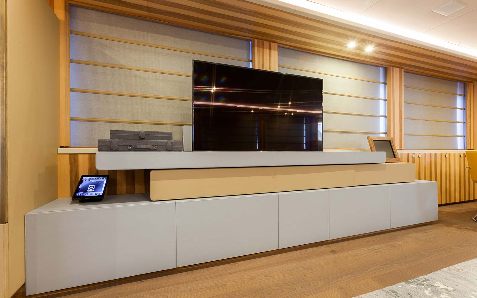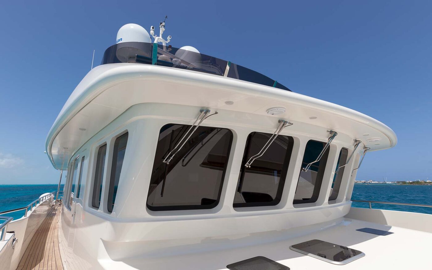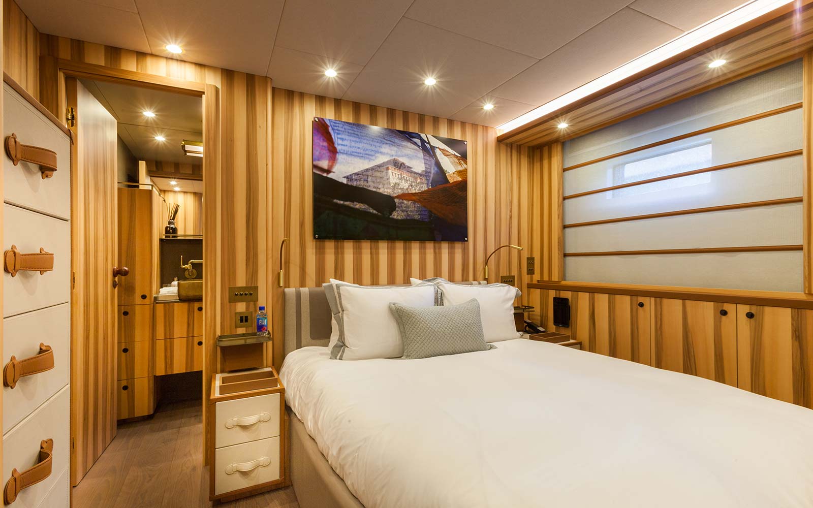 The interiors are designed by the Archistar Simon Hamui, able to give an Explorer twist to salons and cabins thanks to a wise blend of liquidambar timber, hand-stitched leathers drawers and cabinets resembling vintage Louis Vuitton travel bags, antique brass Waterworks faucets and an elegant choice of free-standing furniture.