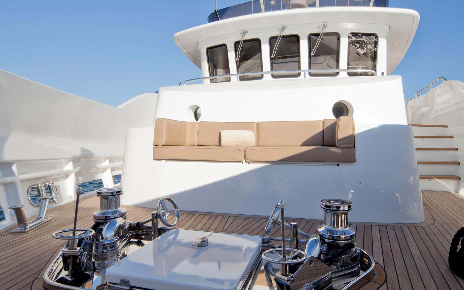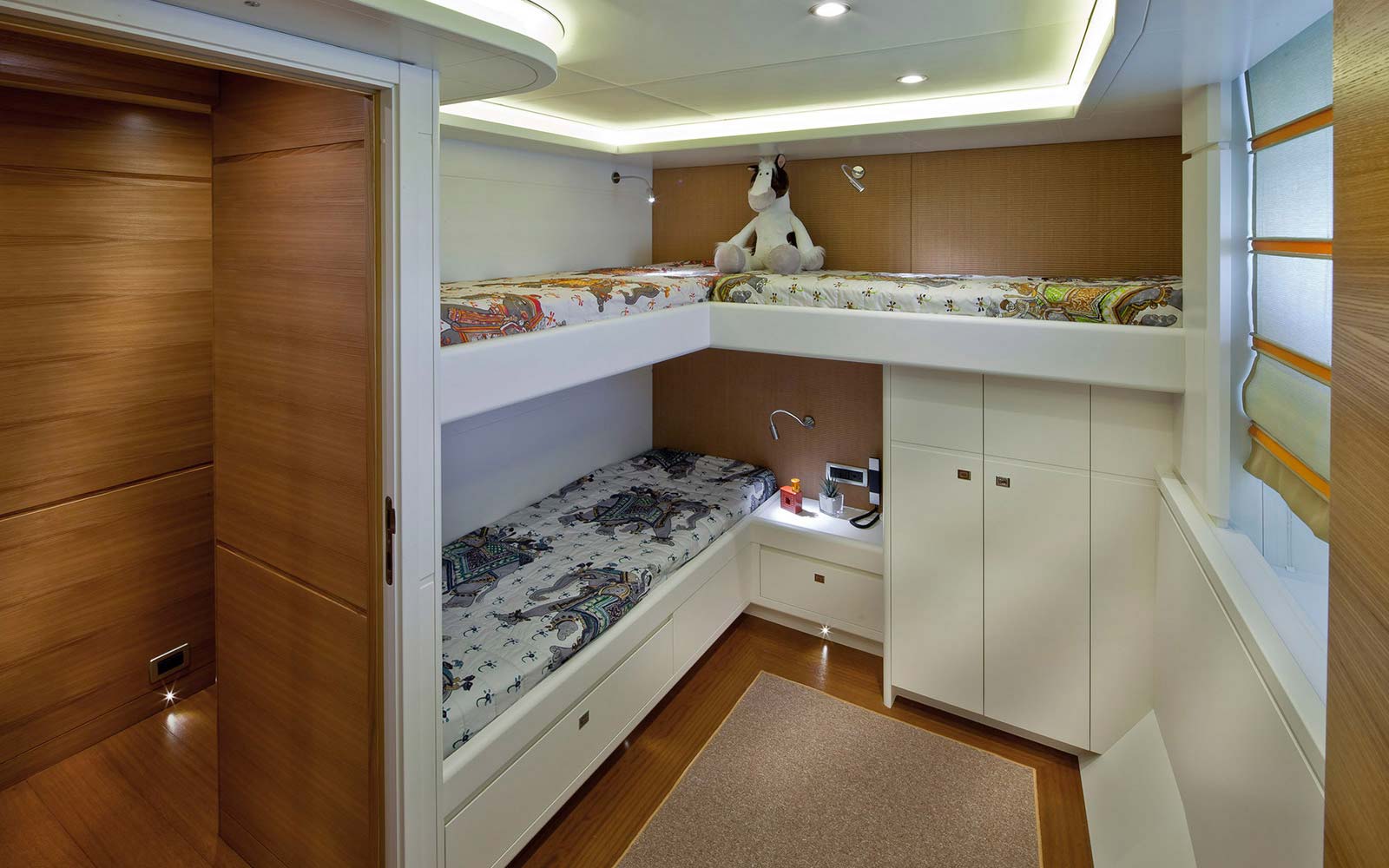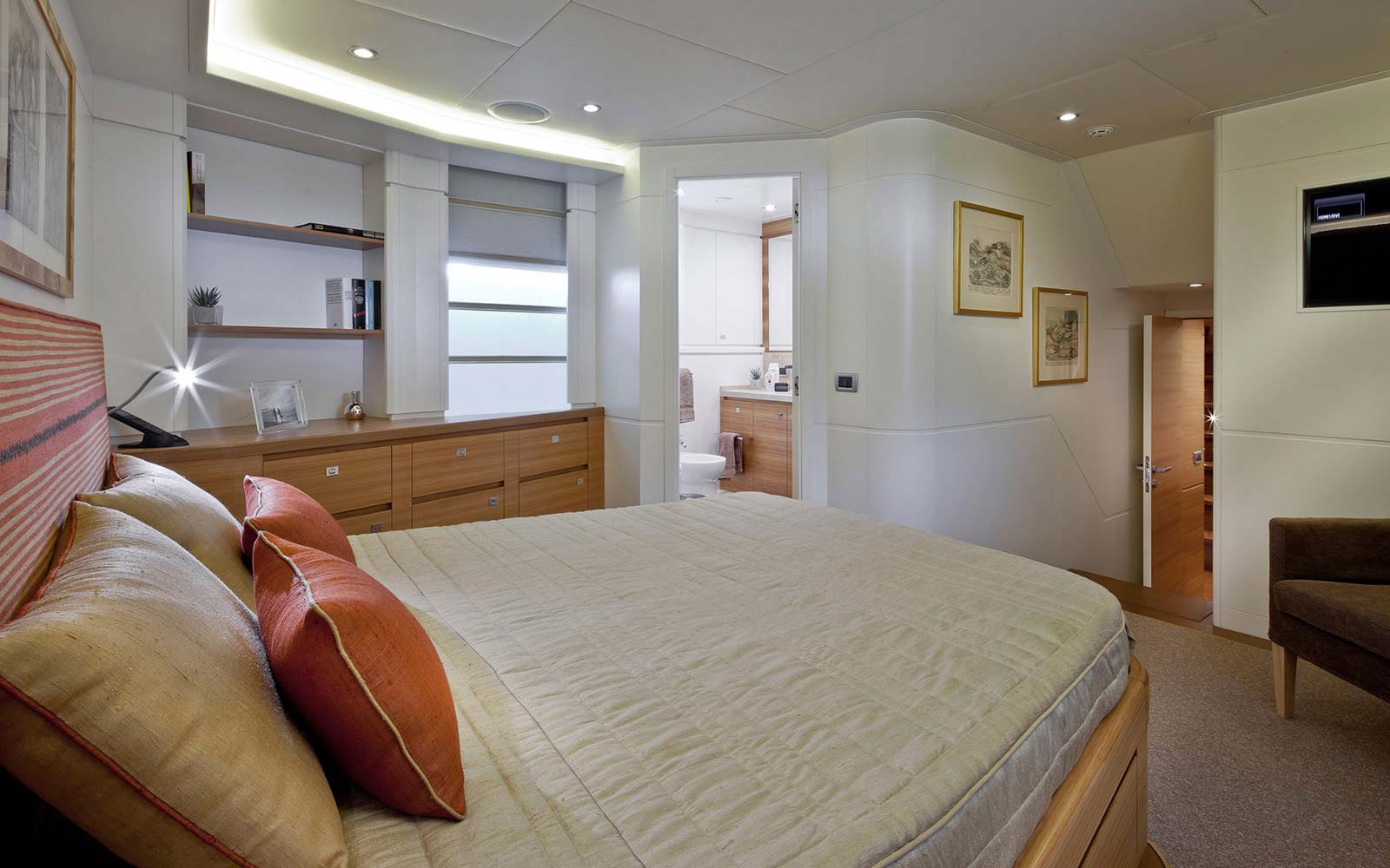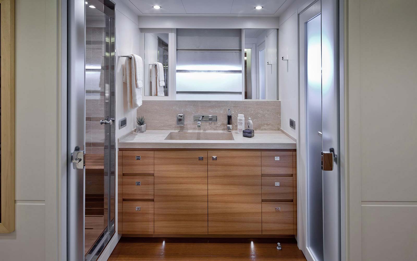 The yacht’s interior design distinguish itself thanks to the linearity and lightness of the materials. Everything has been thought considering the personality and the voyage plans of the owners