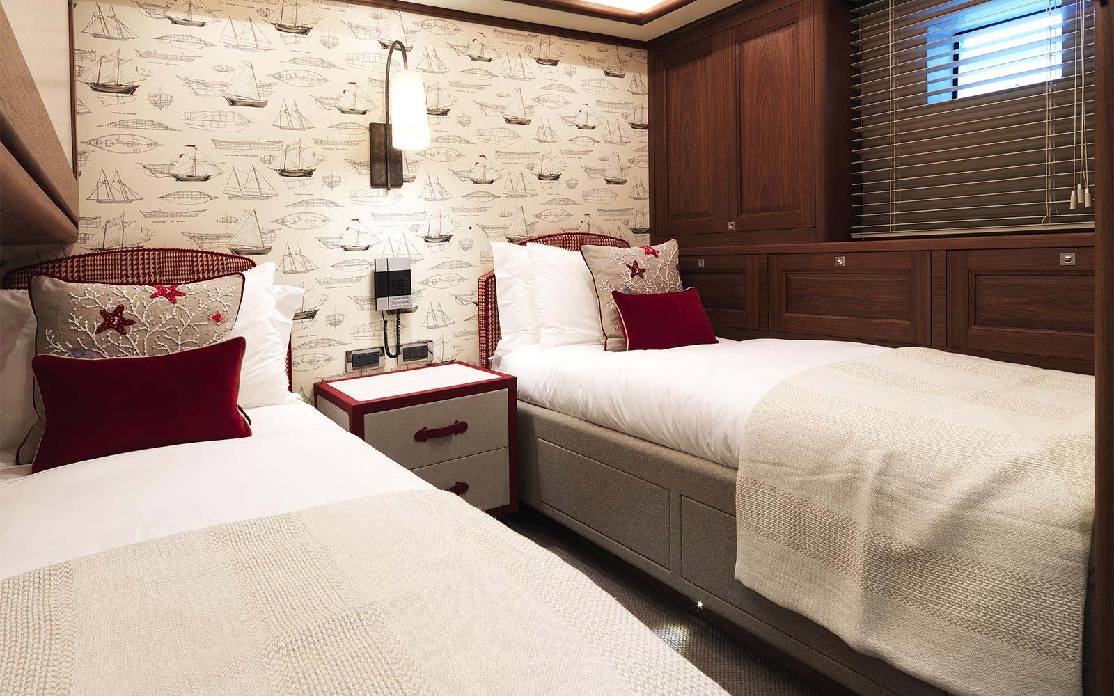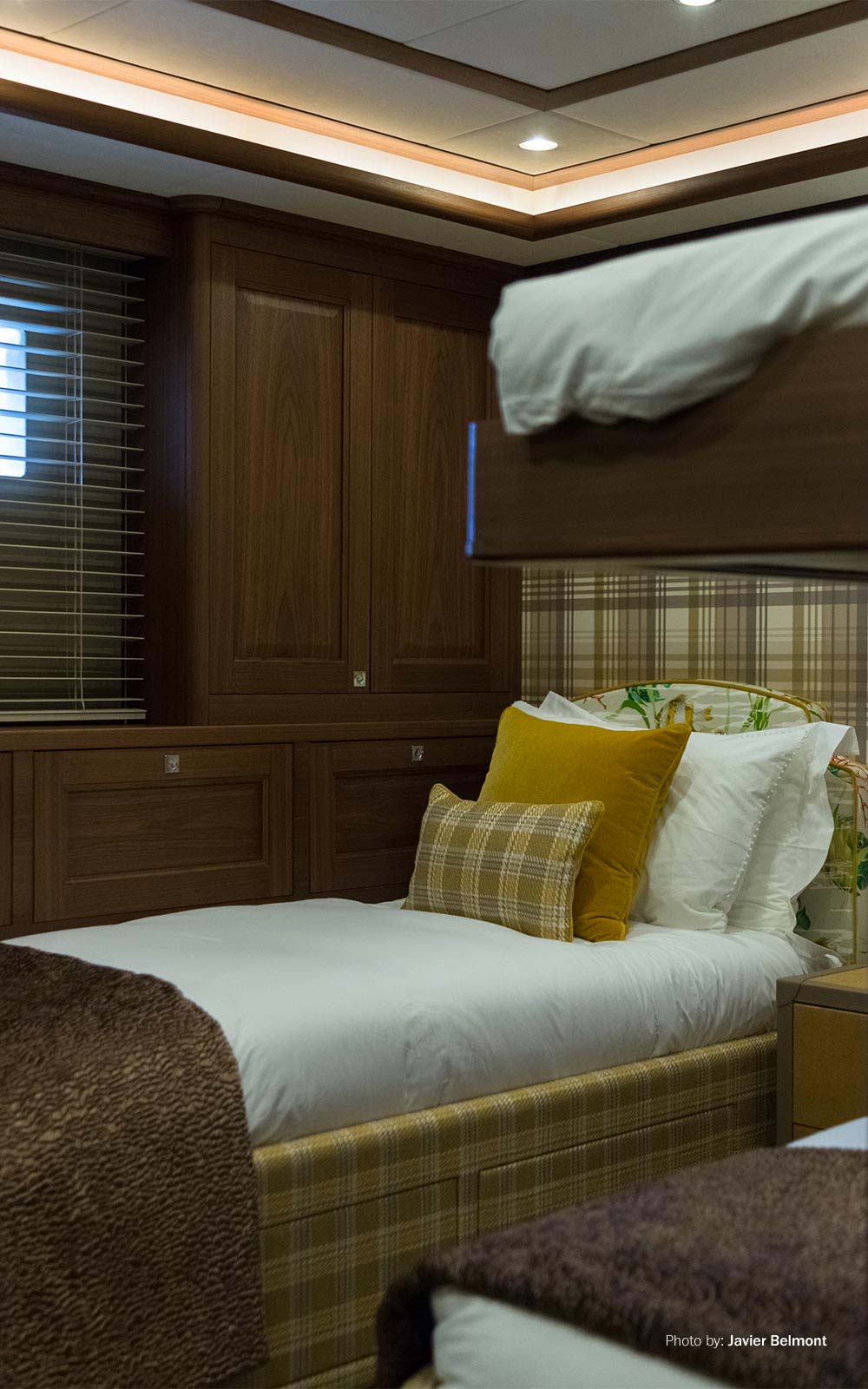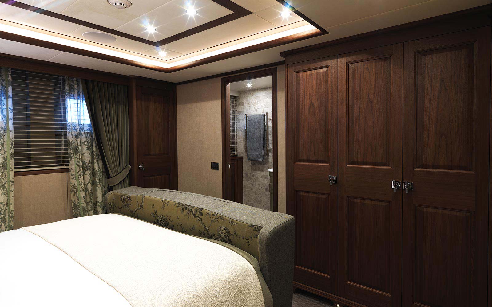 MY Storm accommodates 12 guests in 5 cabins: the Owner stateroom is found on main deck forward whereas four guest cabins are found on lower deck: two of them are fitted with double bed whereas the other two have single beds and a pullman bed.