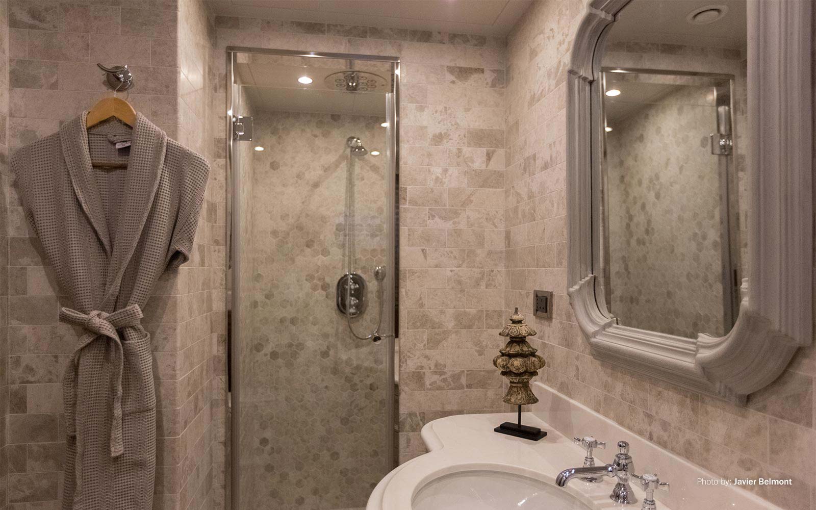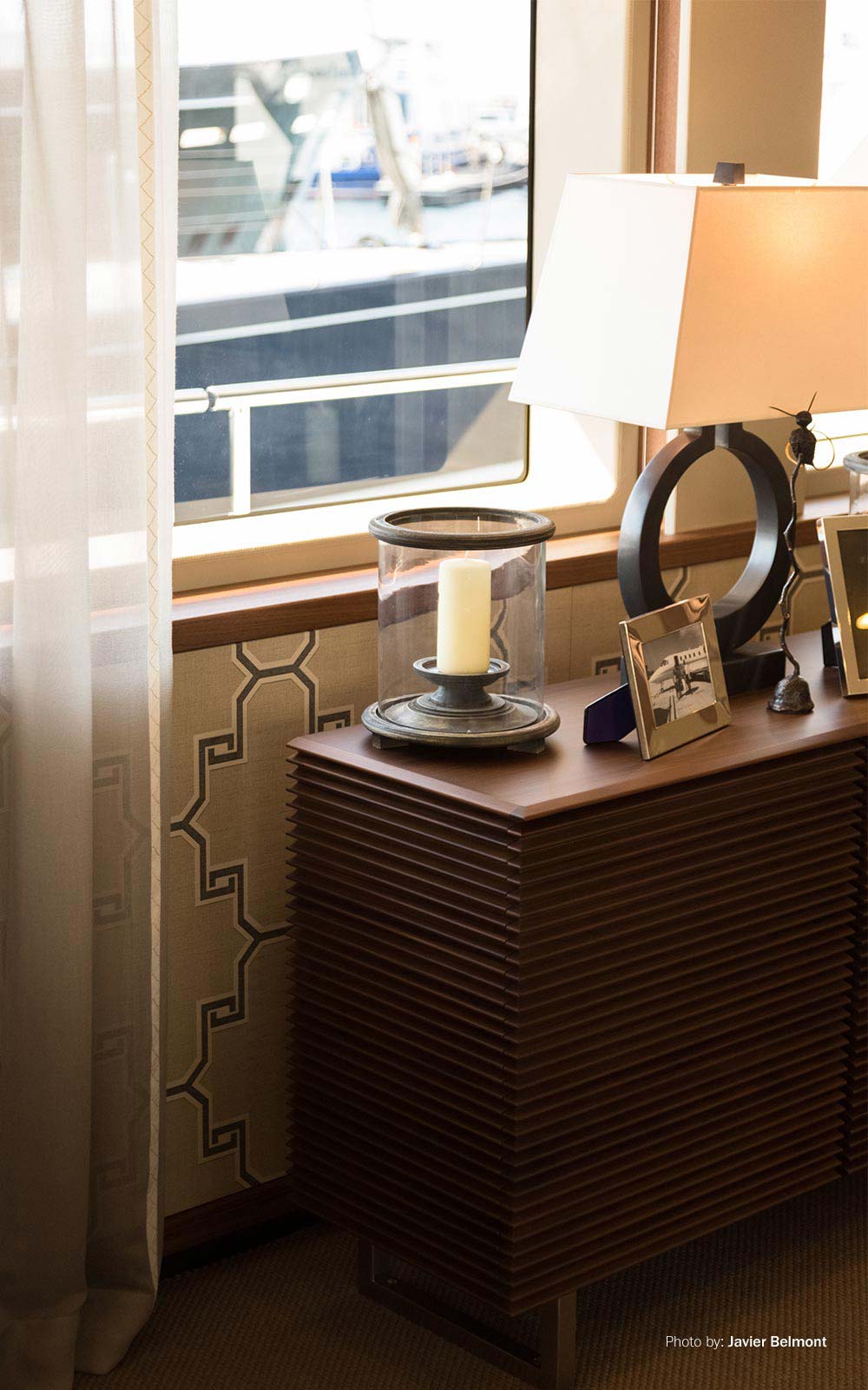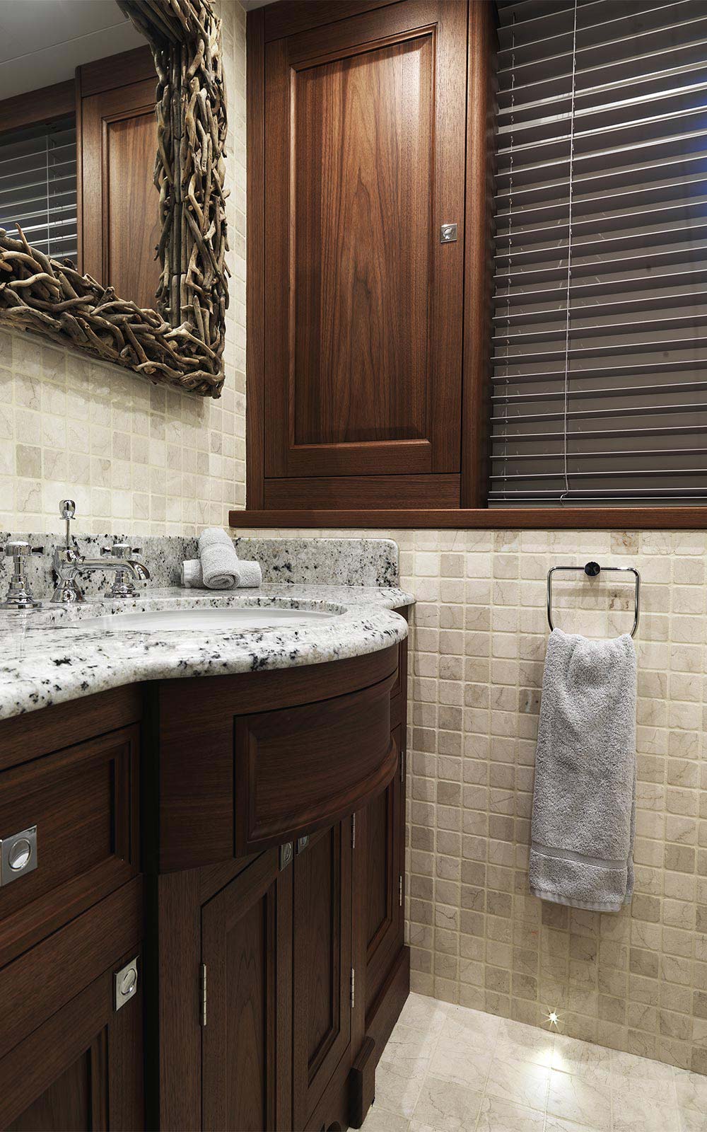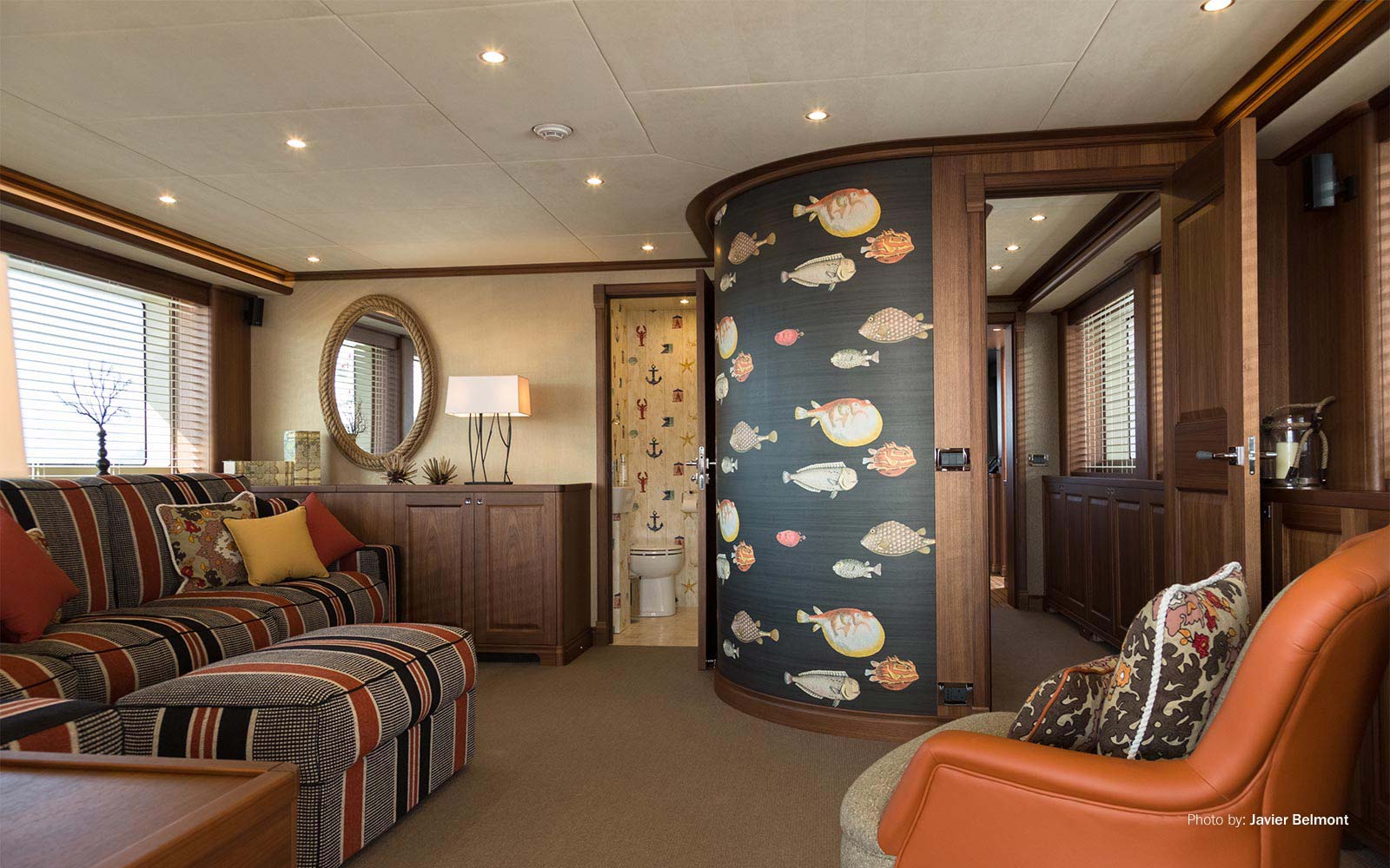 The interiors are designed by Pierluigi Floris who along with the Owner family was able to confer to this Explorer vessel a very comfy and warm atmosphere in which dark wood, elegant fabrics, refined wall papers are masterfully blended together.