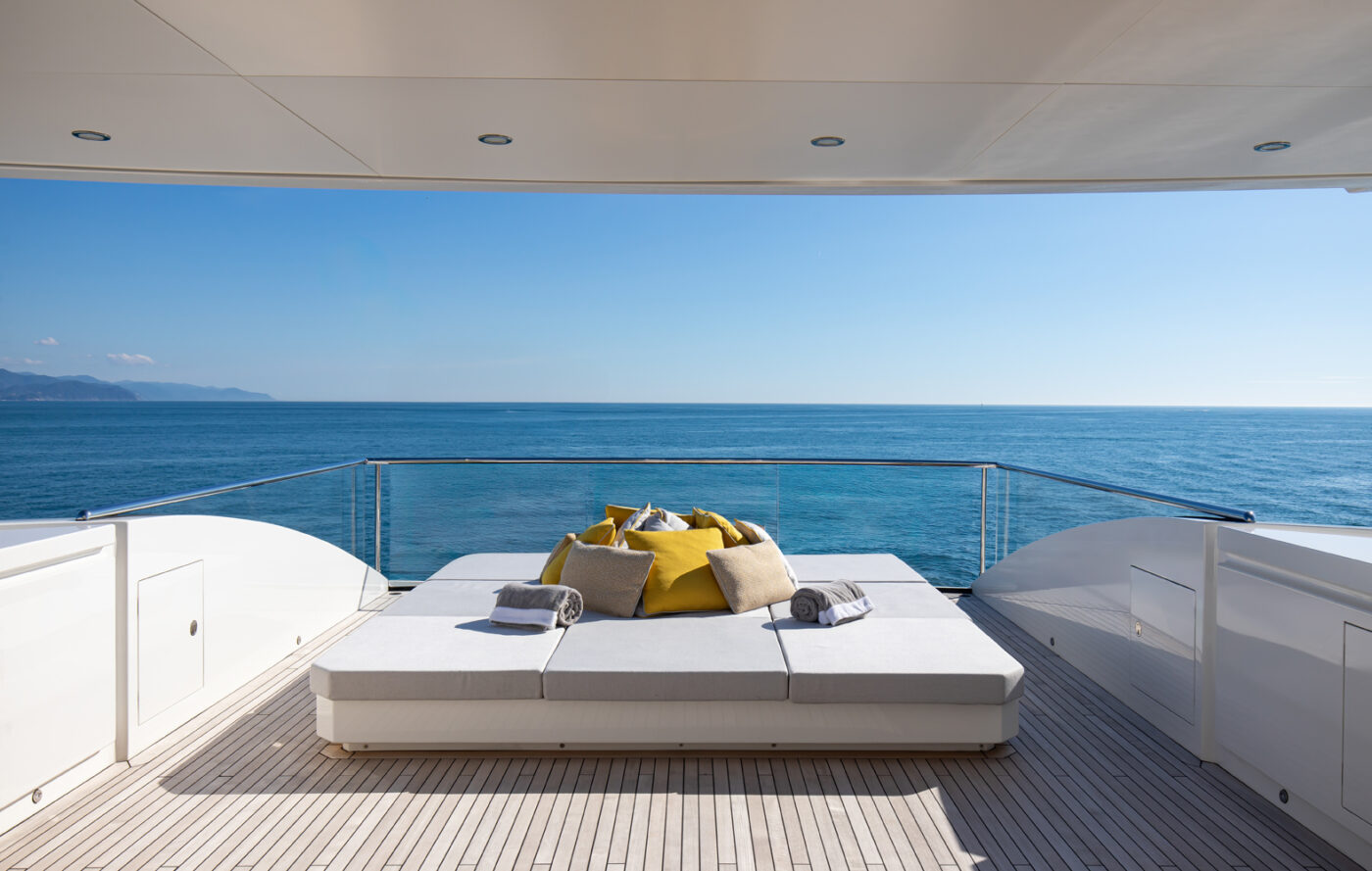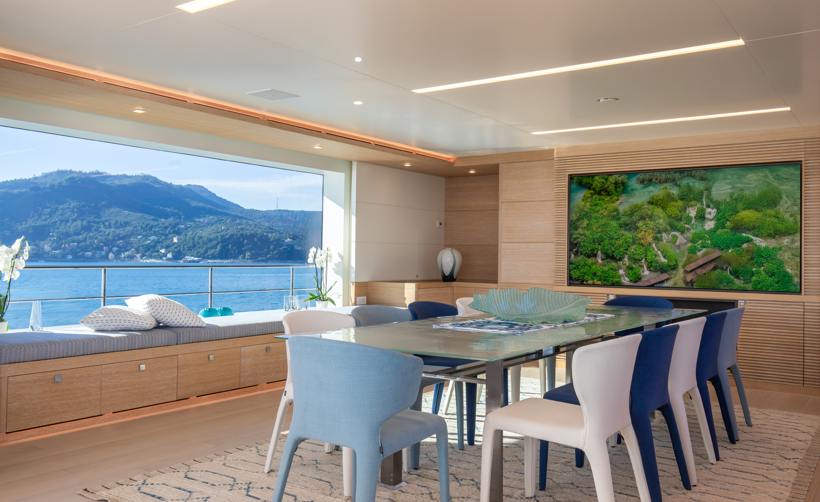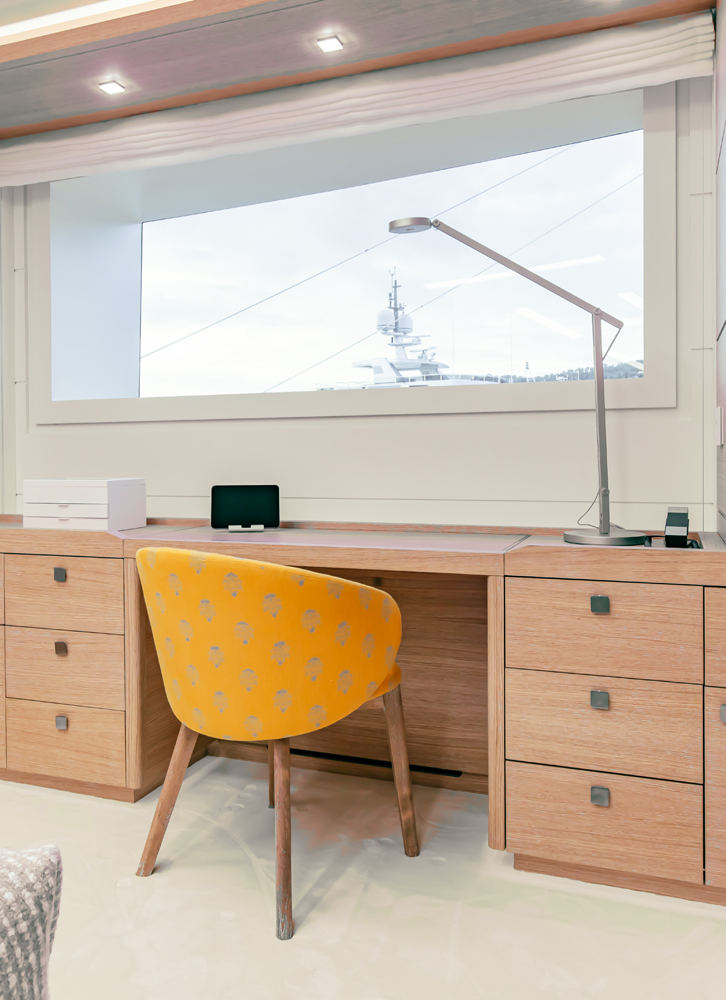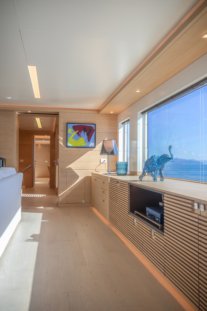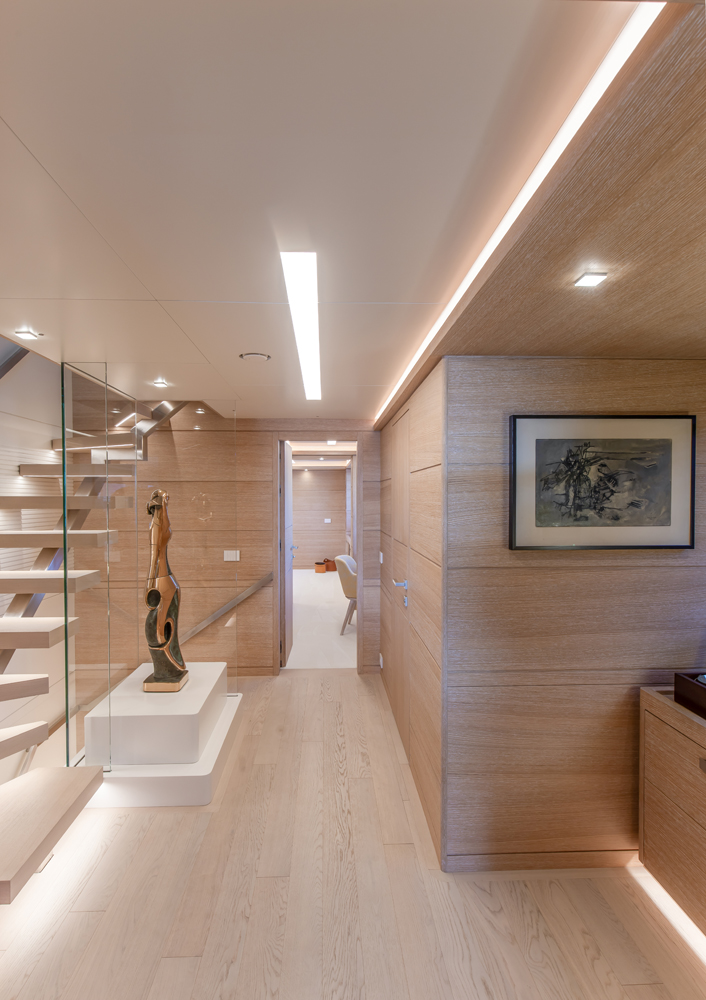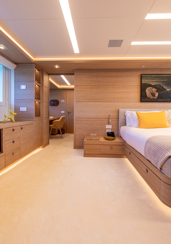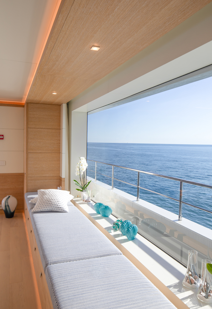 The yacht’s interior architecture is clean and refined with natural materials that are pleasantly tactile and colors that are light and pleasant to live among. The play of reflected light brings an element of constant movement to the interiors that enlivens and enriches the appeal of clean forms and natural tones.