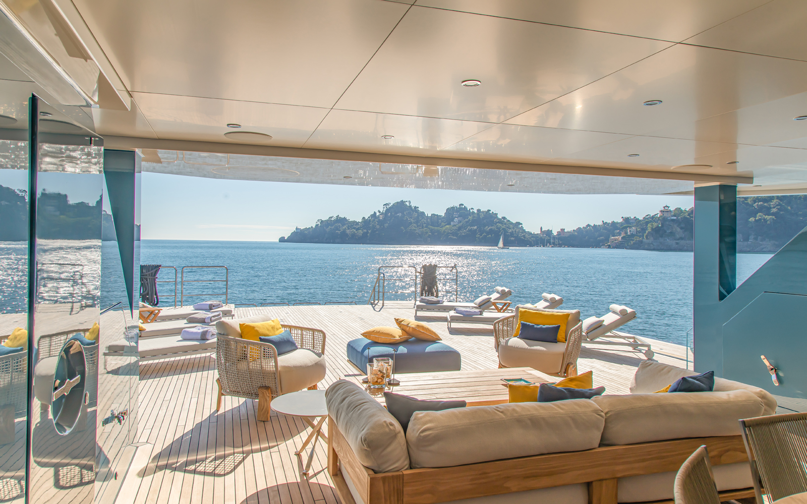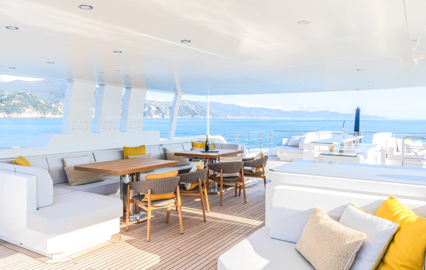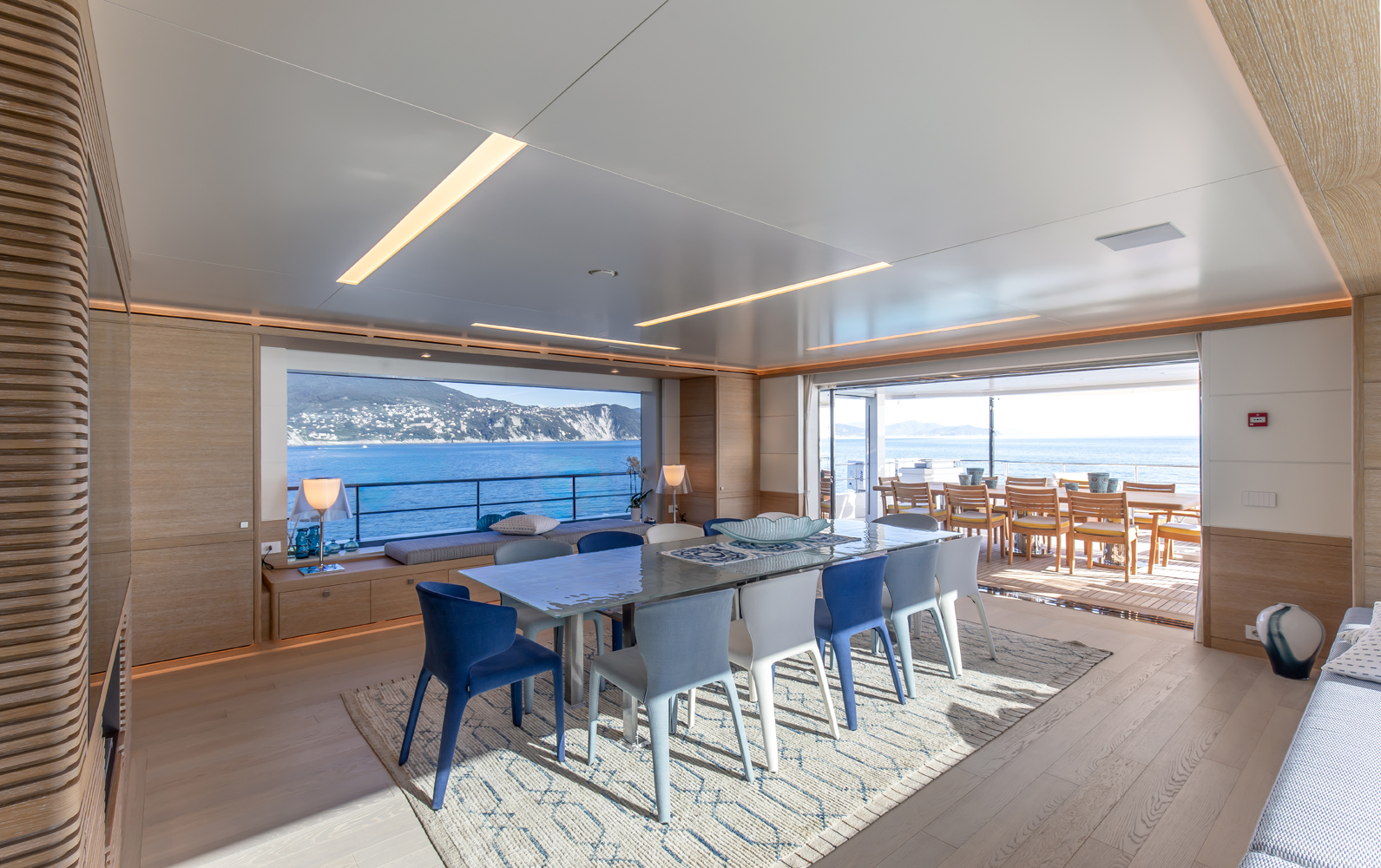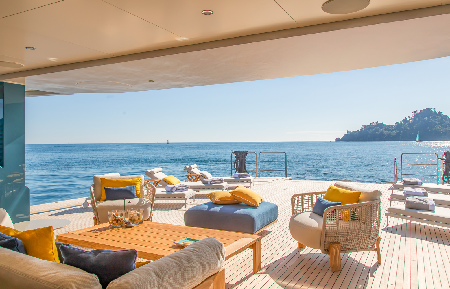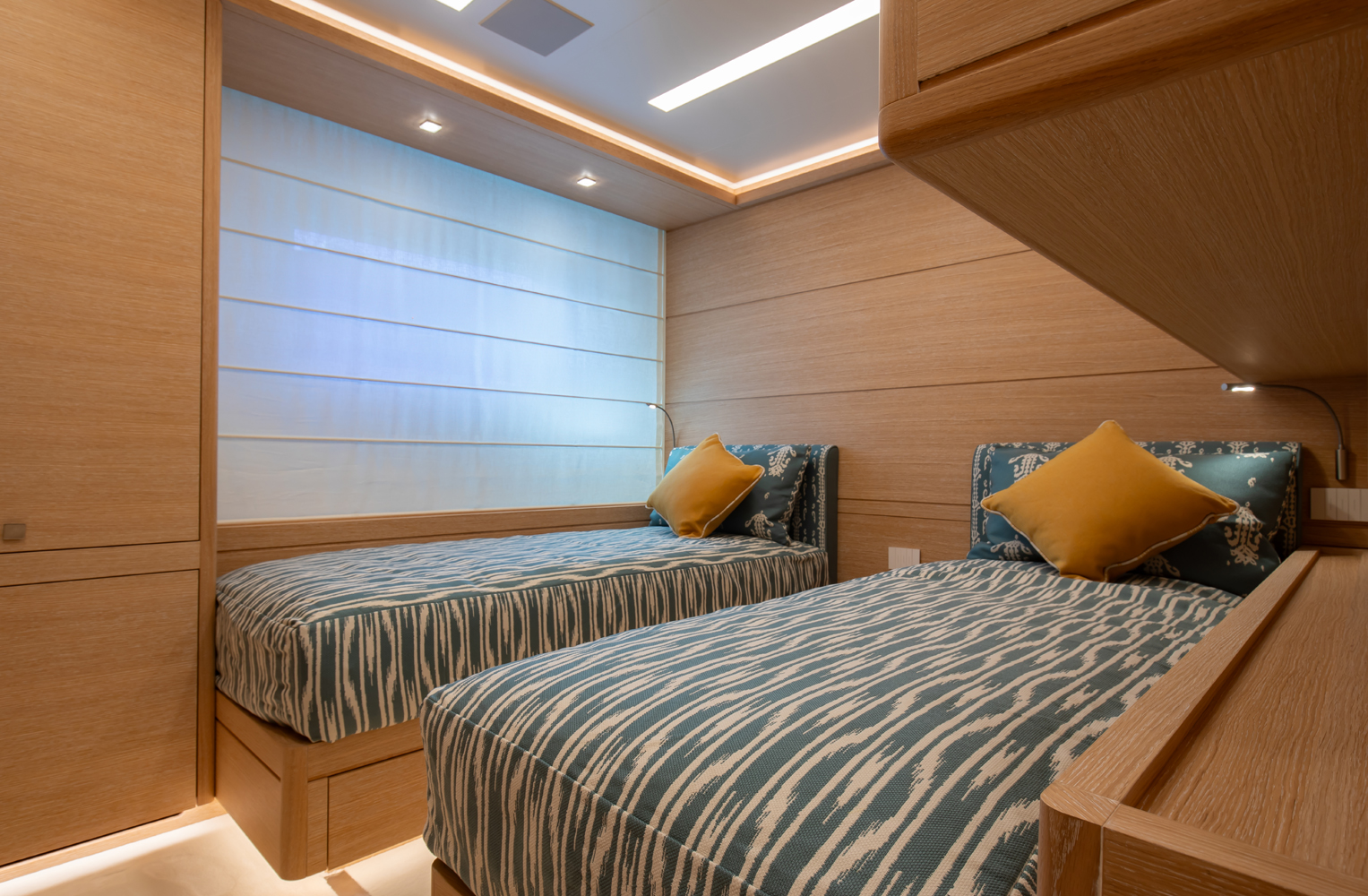The yacht’s interior architecture is clean and refined with natural materials that are pleasantly tactile and colors that are light and pleasant to live among. The play of reflected light brings an element of constant movement to the interiors that enlivens and enriches the appeal of clean forms and natural tones.
