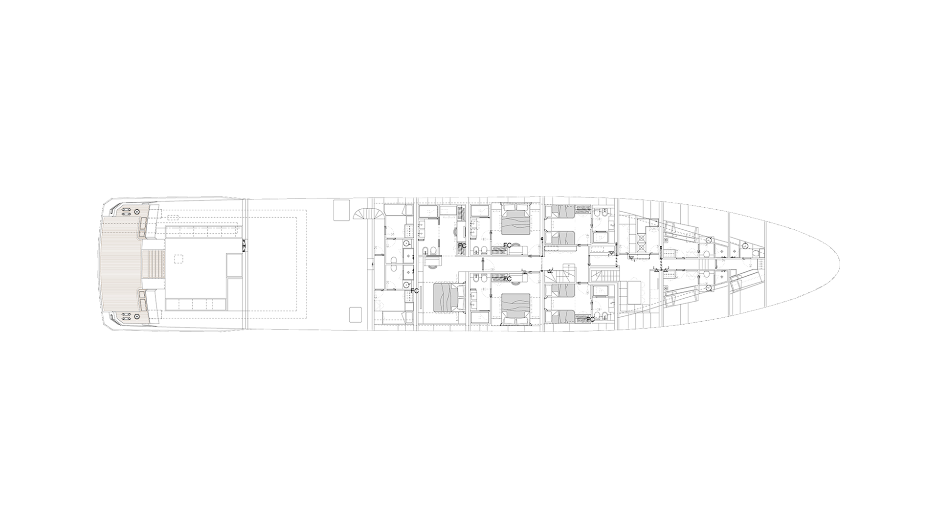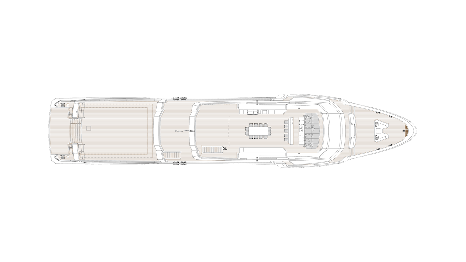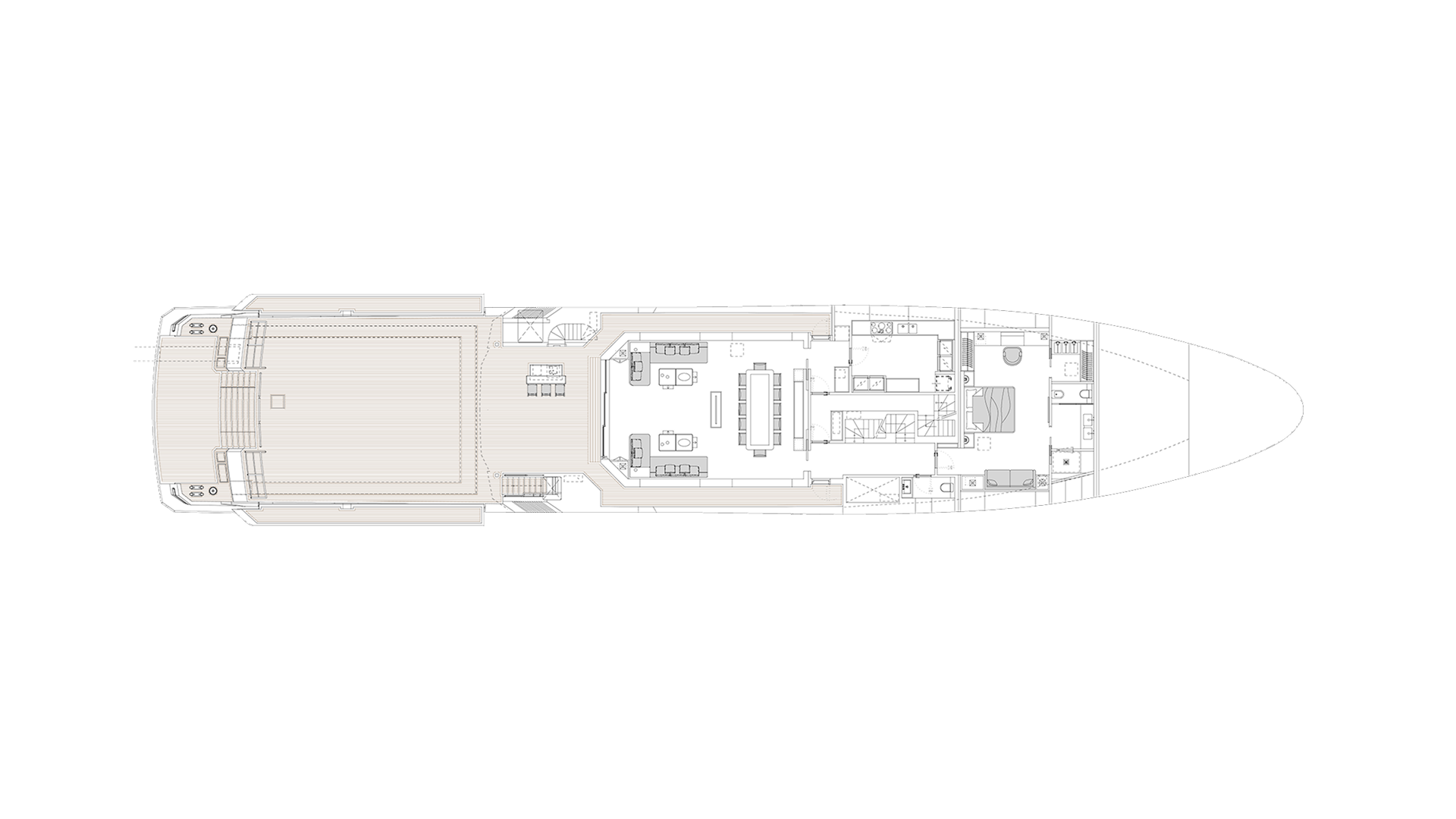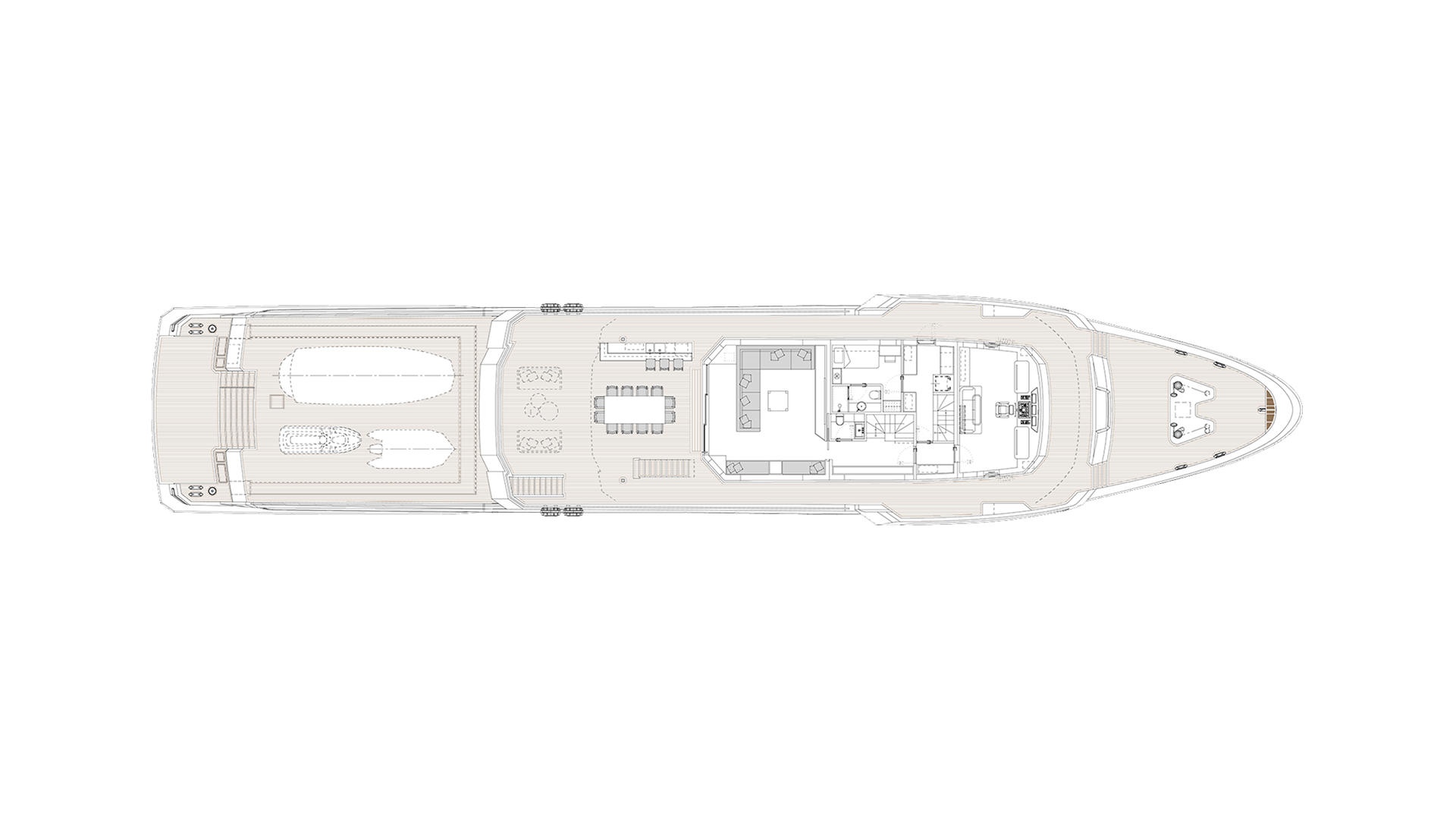 This area exemplifies the concept of flexibility, seamlessly transitioning from a utilitarian space for storing a large tender during extended passages to an extremely spacious and versatile outdoor entertainment area where Owners and guests can enjoy life en plein air. The area can be further enlarged thanks to collapsible bulwarks.