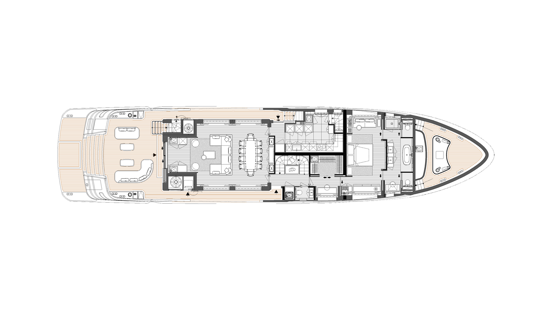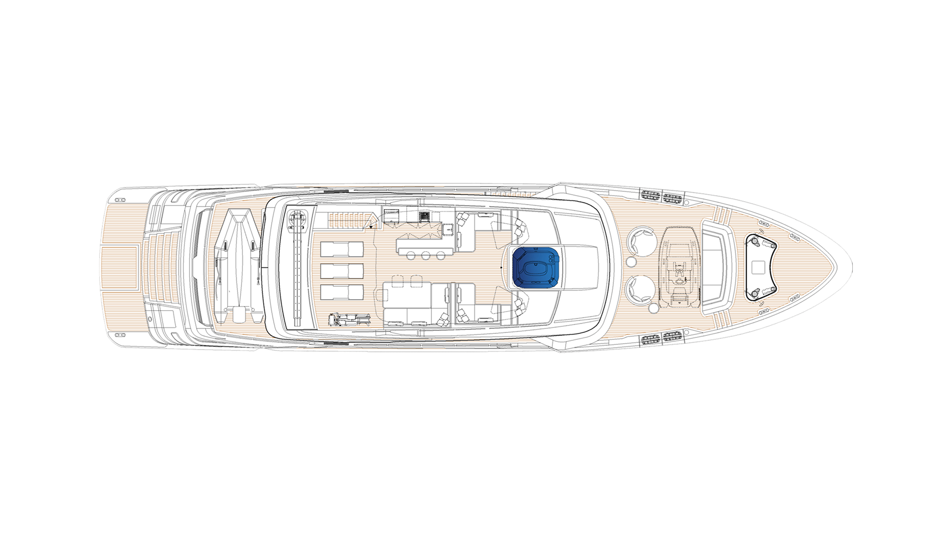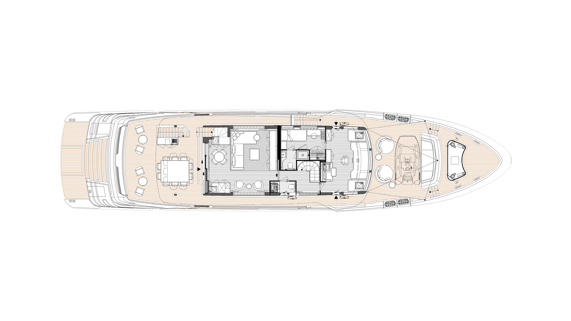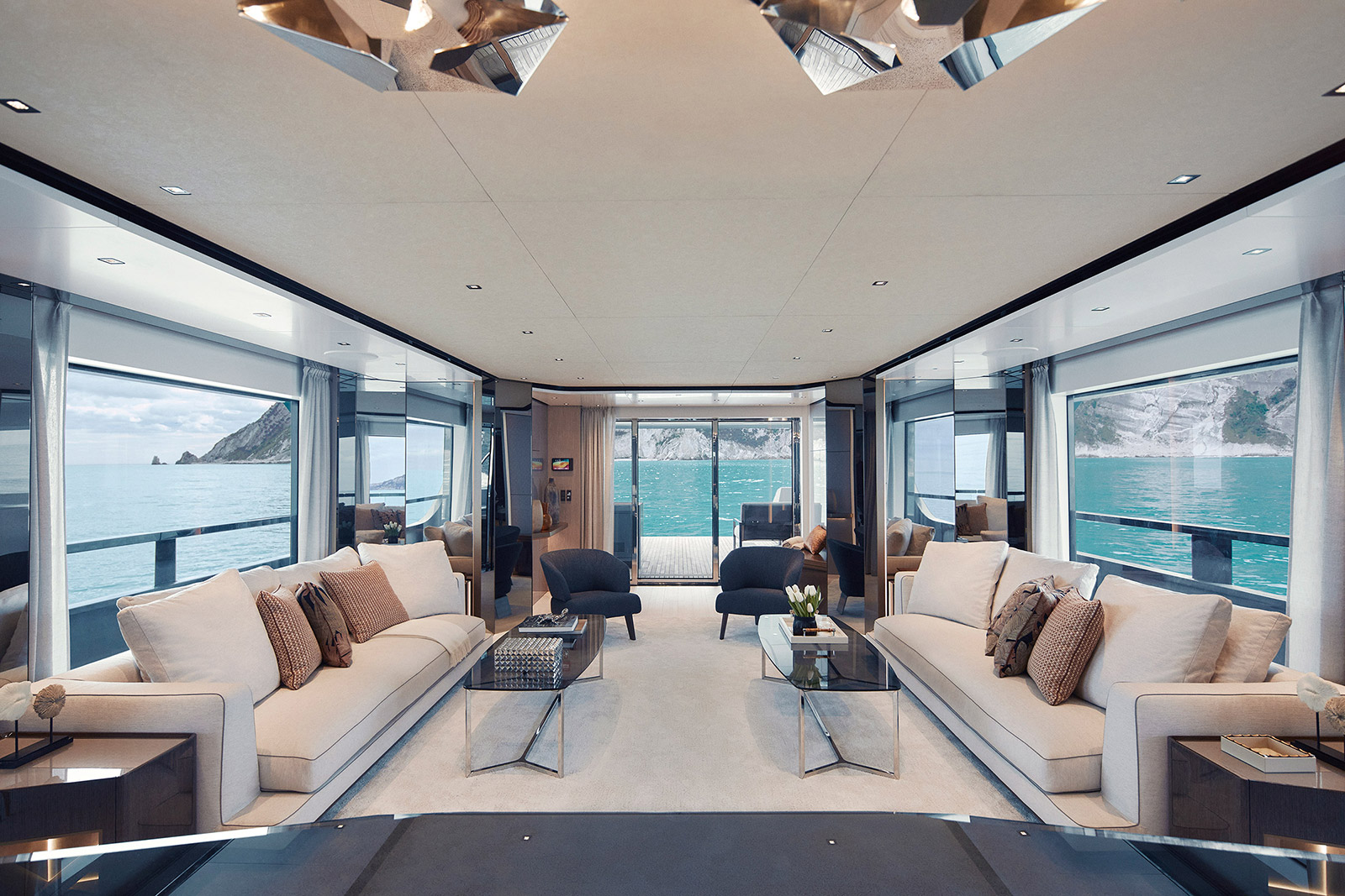 An extensive use of glass in the bulwarks and the open stern enhance the visual continuity with the surrounding environment.
