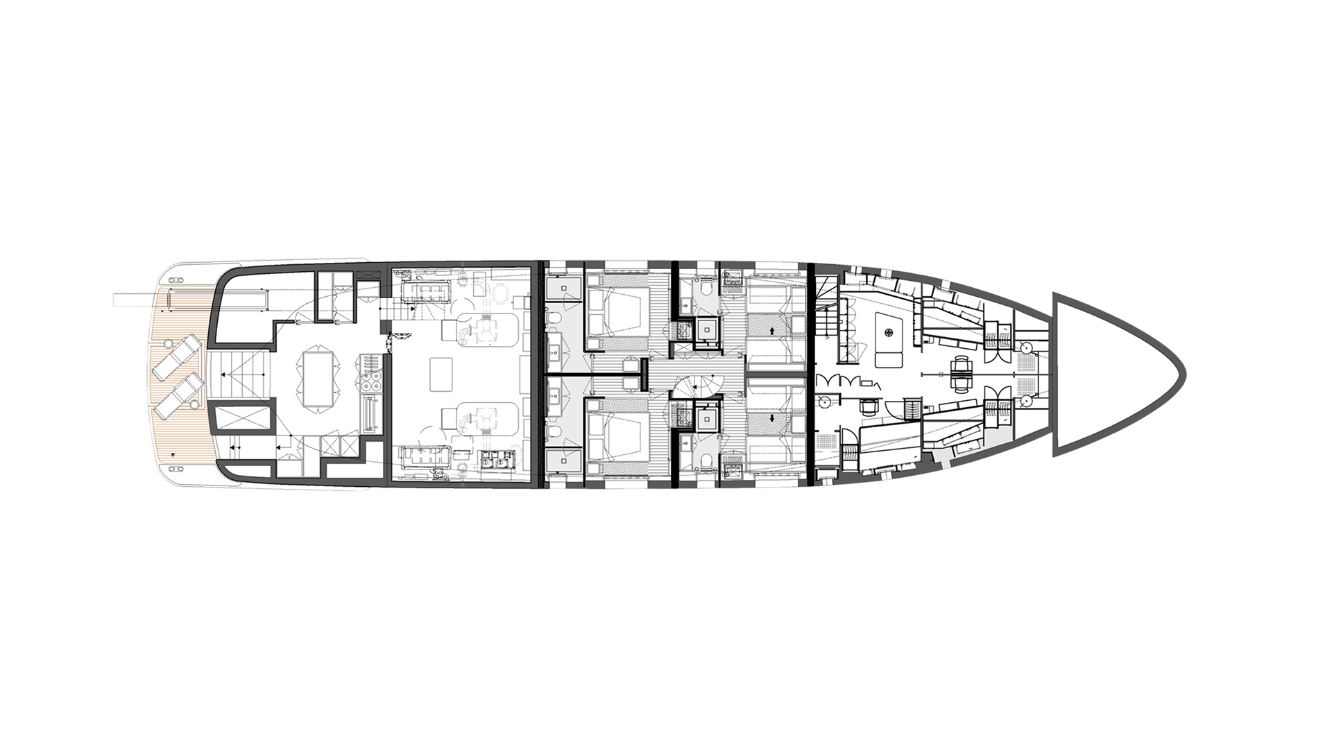 Stellamar’s profile is tense yet it encompasses sensuous lines that add an unrivalled elegance to her exterior design. With this project, Francesco Paszkowski shows that medium size dimensions are not the enemy of creativity as they make it more effective. Paszkowski succeeded in providing the 35m yacht with large spaces and luxury amenities while staying true to her explorer yacht’s soul.