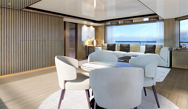 An imposing explorer yacht, Project B2 strikes a distinctive pose. Paszkowski designed grand exterior deck spaces so guests can relax in a number of outdoor spots designed to offer maximum privacy while creating the feeling of openness and uninterrupted living spaces. Her bright interiors by Paszkowski Design exude a refined elegance, combining sophistication with an inviting, unpretentious atmosphere.