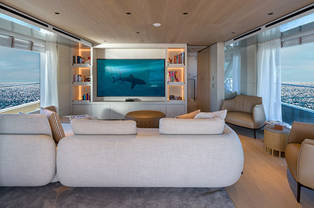 Great emphasis has been given to outdoor areas with large lounging/dining areas on all decks. Yet, should you have enough of sun and wind, when you enter the Main or Upper salon you don’t lose contact with the outdoors as vast windows light the rooms while visually connecting them to the sea beyond.