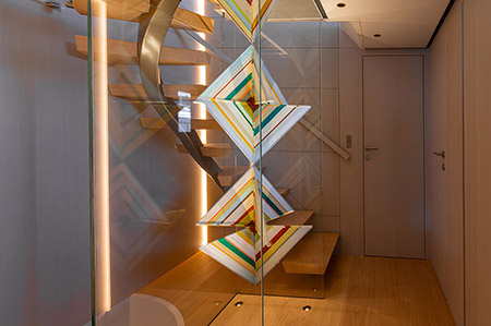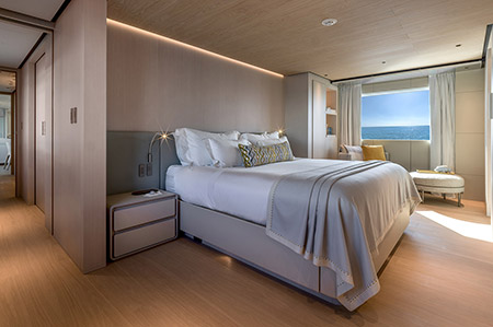 Both owners were very much involved in the project, and she, as an architect herself, gave an important contribution to its development. The yacht’s interior design and decoration are easy on the eye through and through and shapes remain just as soft as the neutral color palette. Textures of both wood and fabrics also play a central role by echoing materials found in nature. The interior decoration of Stellamar, in its entirety, work in harmony creating warm and welcoming environments. An extensive use of bright natural oak for flooring and ceilings and cream leather wall paneling gives the interior a soothing atmosphere throughout the yacht, in both social and private areas. Paszkowski in collaboration with Margherita Casprini designed all fixed furniture and chose, together with the Owners, most of the loose furniture and accessories by renowned manufacturers such as the Arpège Meridienne sofas by Christian Liaigre for the lounging area in the Main Salon, the Poliform Saint Germain sofa in the Skylounge, armchairs Archibald by Poltrona Frau, Cassina Hola chairs in the dining area whose table boasts a beautiful Breccia Aurora marble top.