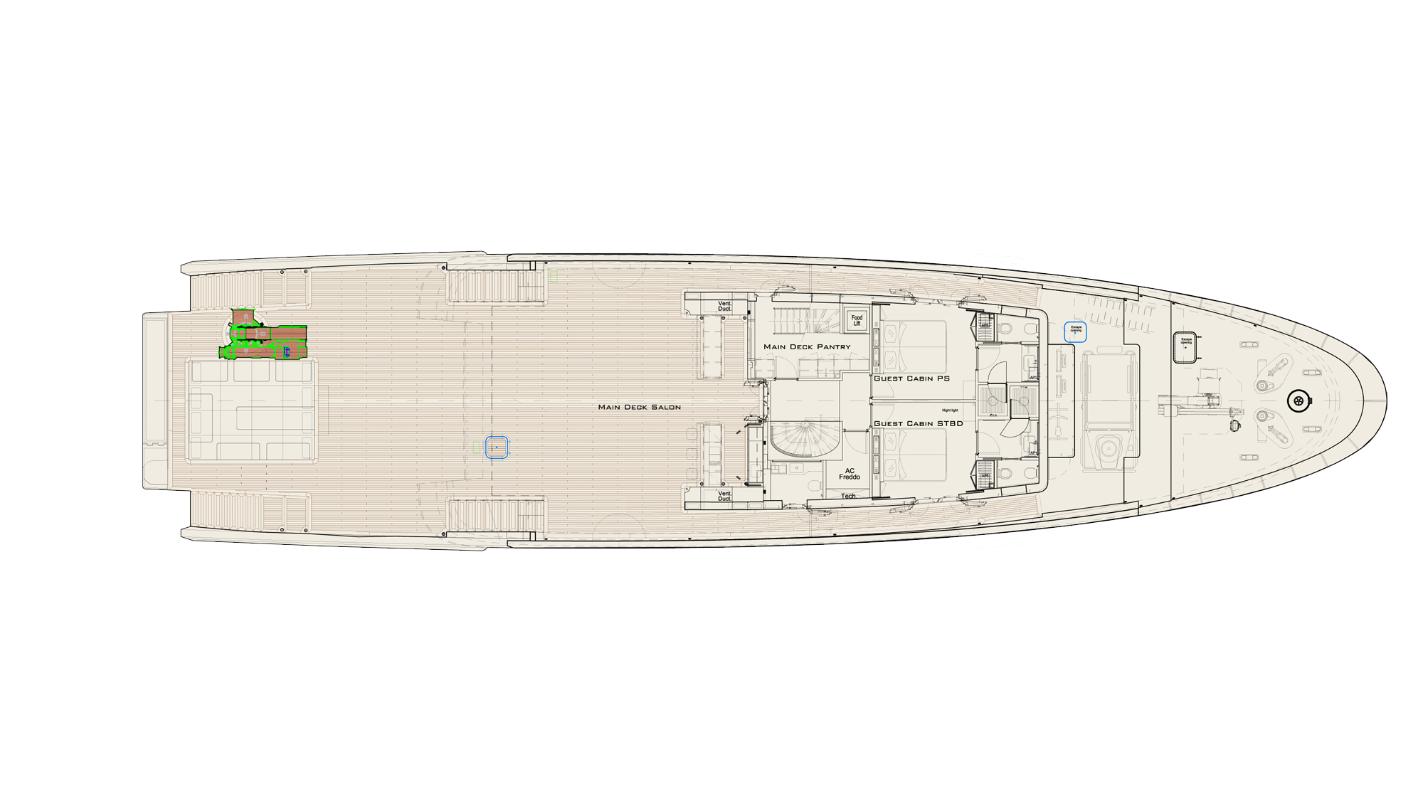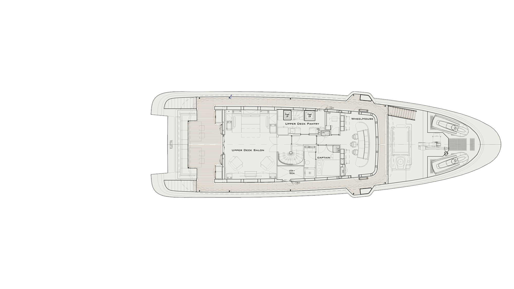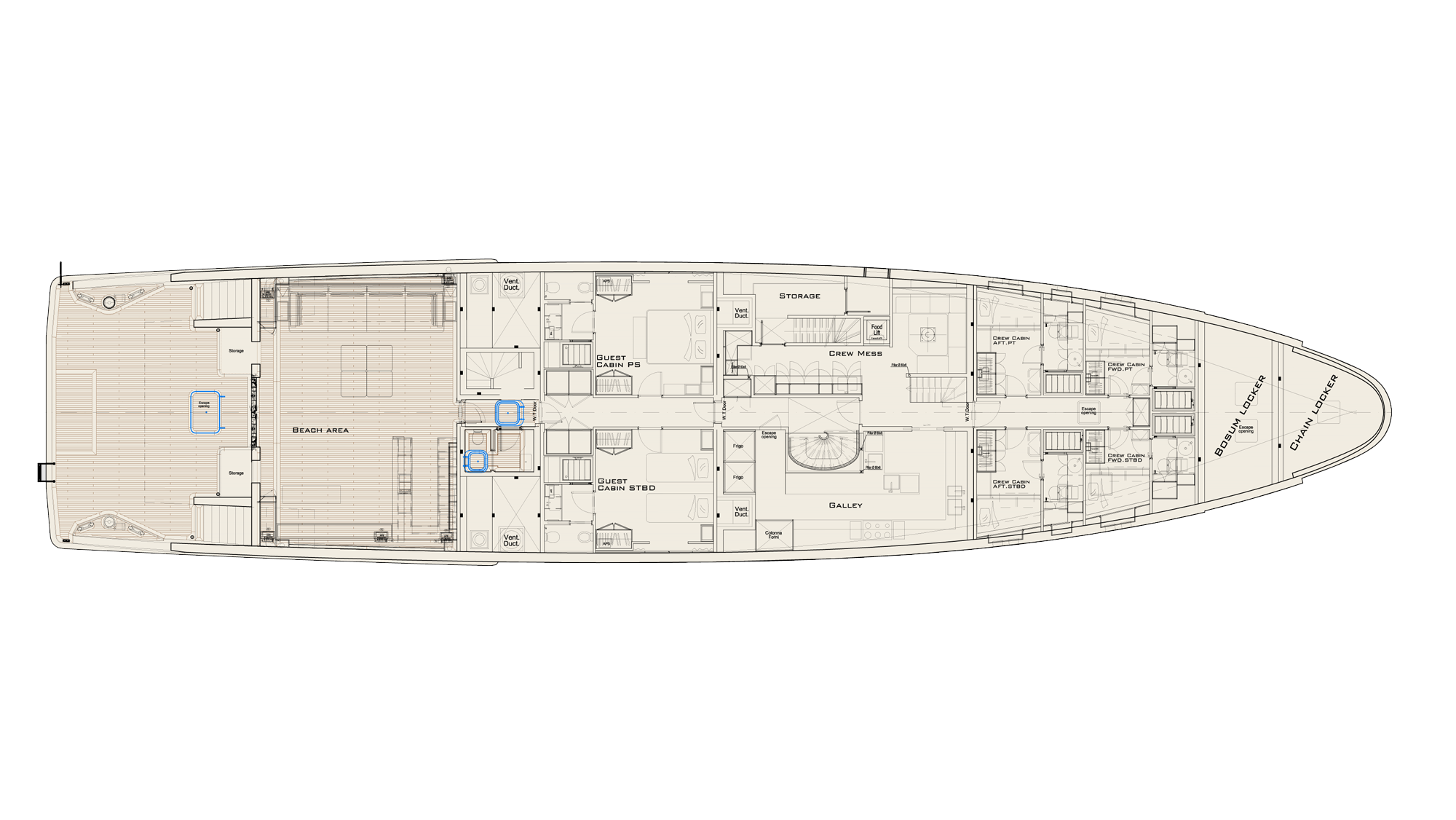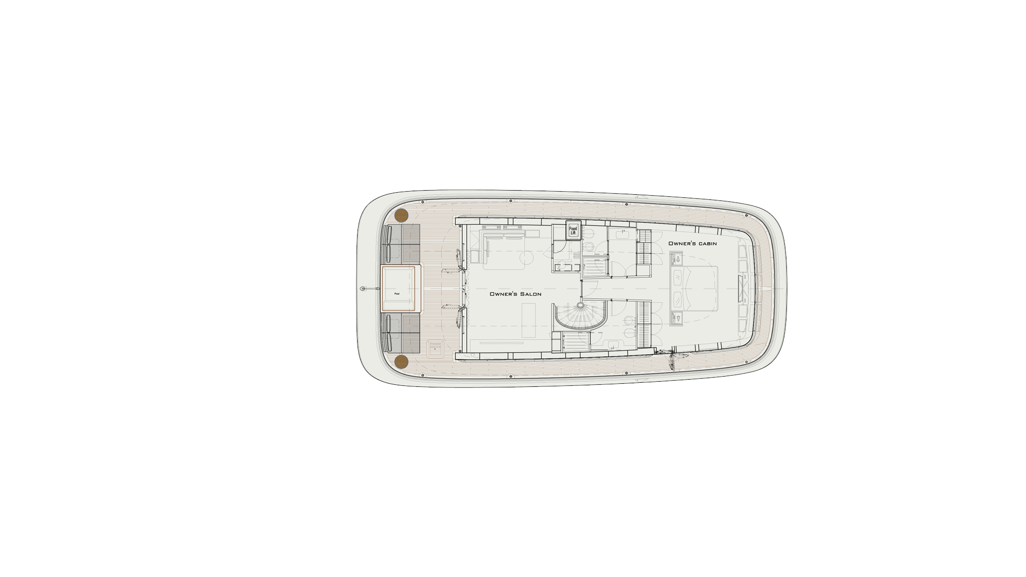 Spread on five deck, a large tank deck included, Audace has 4 guest cabins, two on the Lower deck with balconies, and two on the Main deck with direct access to the side passages. Nine berths for crew. The Owner apartment is on the highest level, above the Upper Deck.