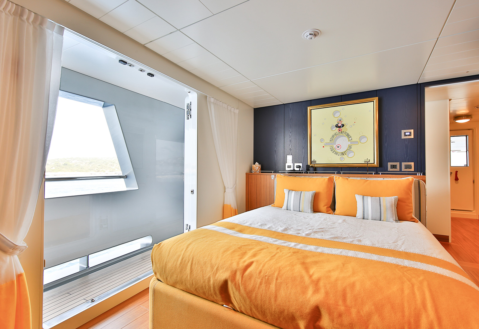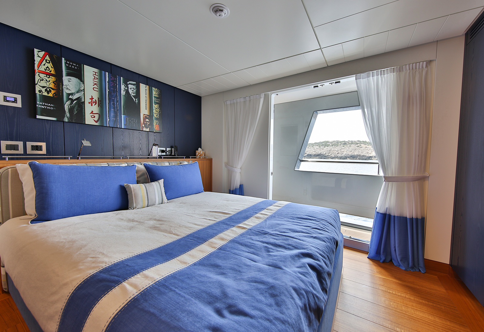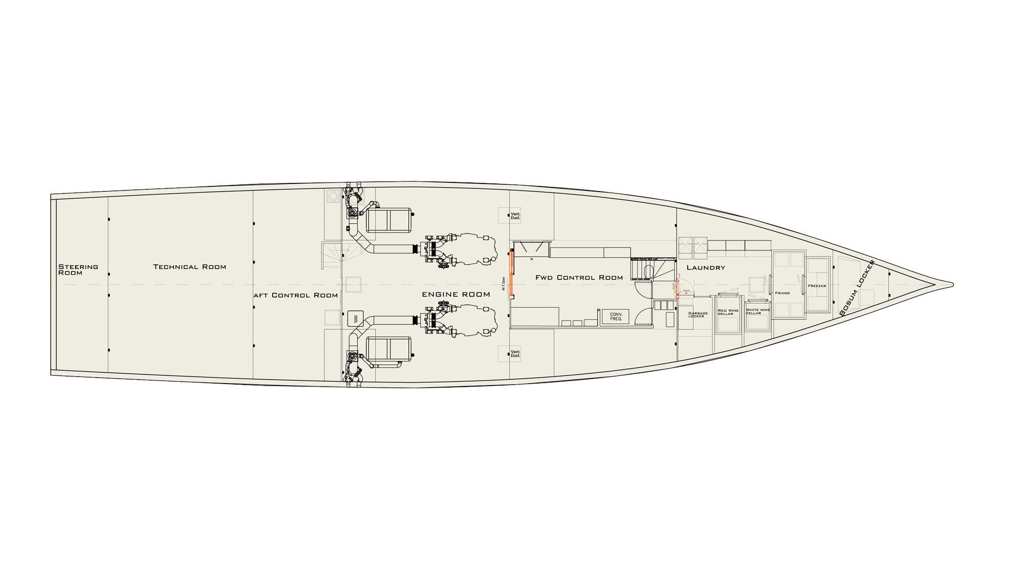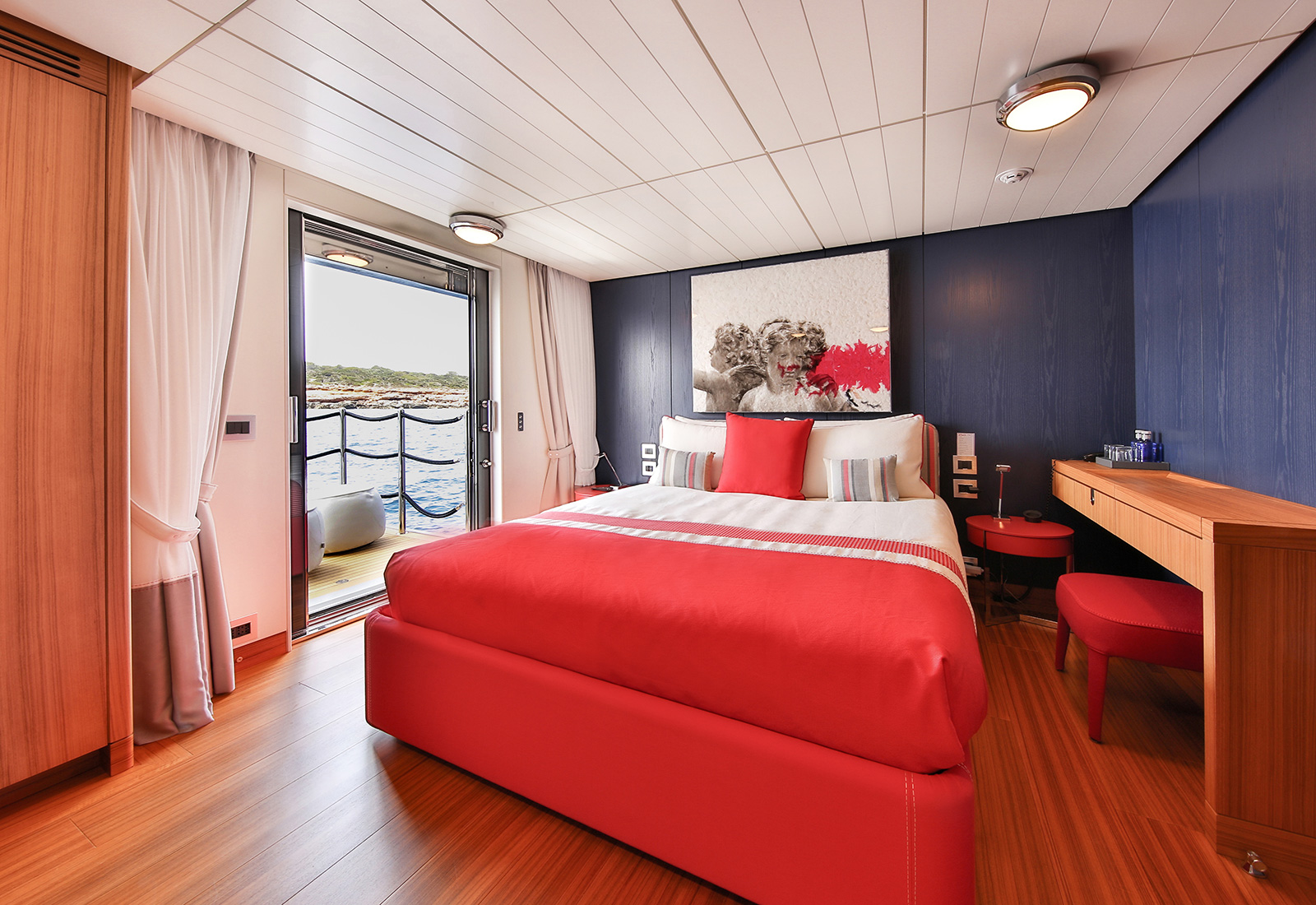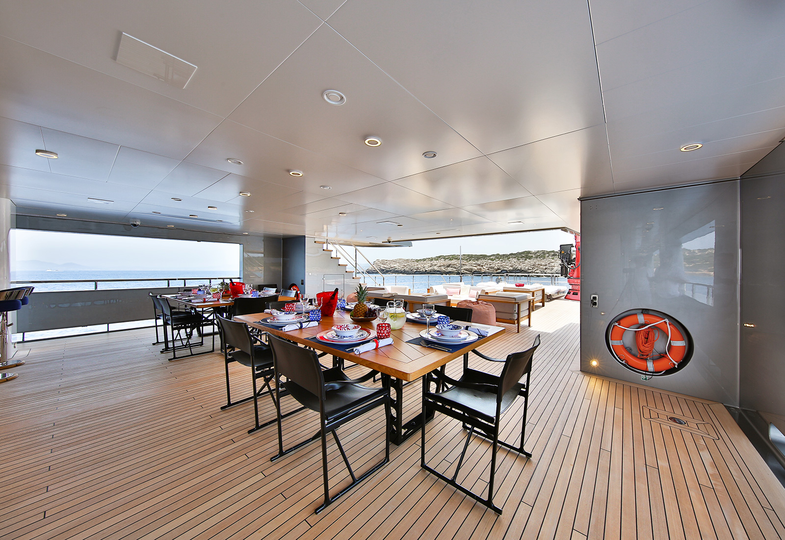 Spread on five deck, a large tank deck included, Audace has 4 guest cabins, two on the Lower deck with balconies, and two on the Main deck with direct access to the side passages. Nine berths for crew. The Owner apartment is on the highest level, above the Upper Deck.