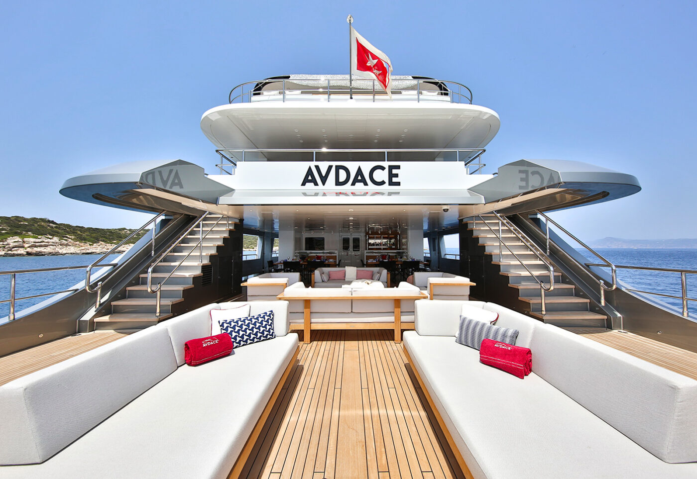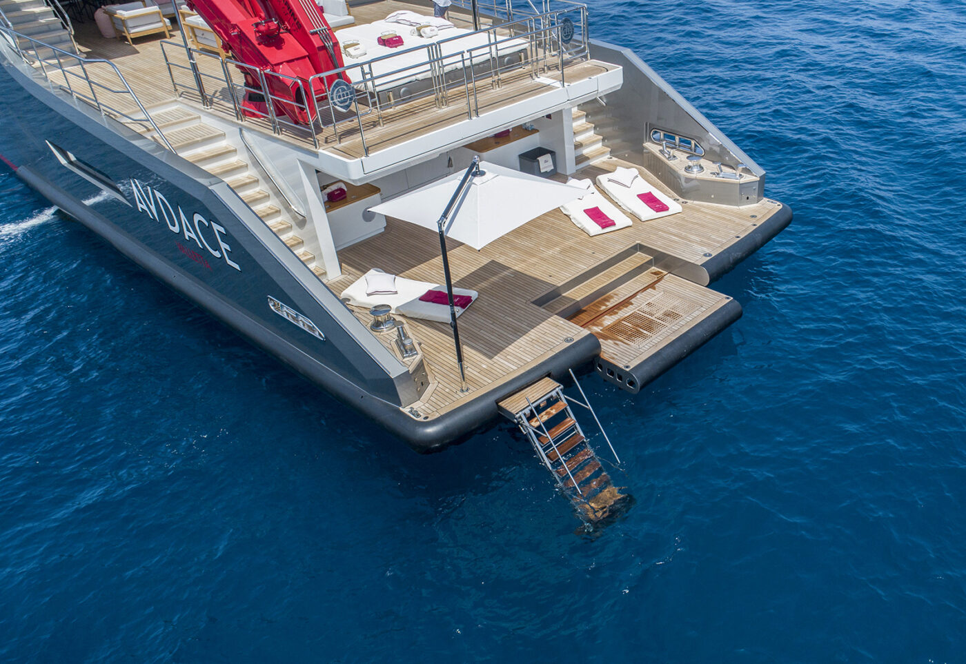 The yacht has a LOA of 42.80m and a large beam of 9.40m. At full load she has a draught of 2.75m. Displacement at full load is 450t. Gross Tonnage 490GT. With twin Caterpillar C32 Acert SWAC EPA T3 and 62,000 litres of fuel, Audace has a range of 5,400nm at 10 knots.