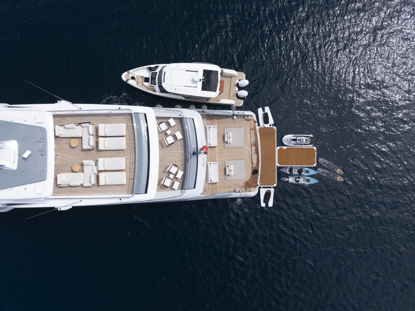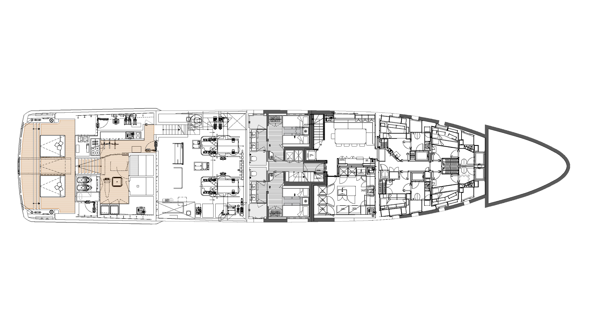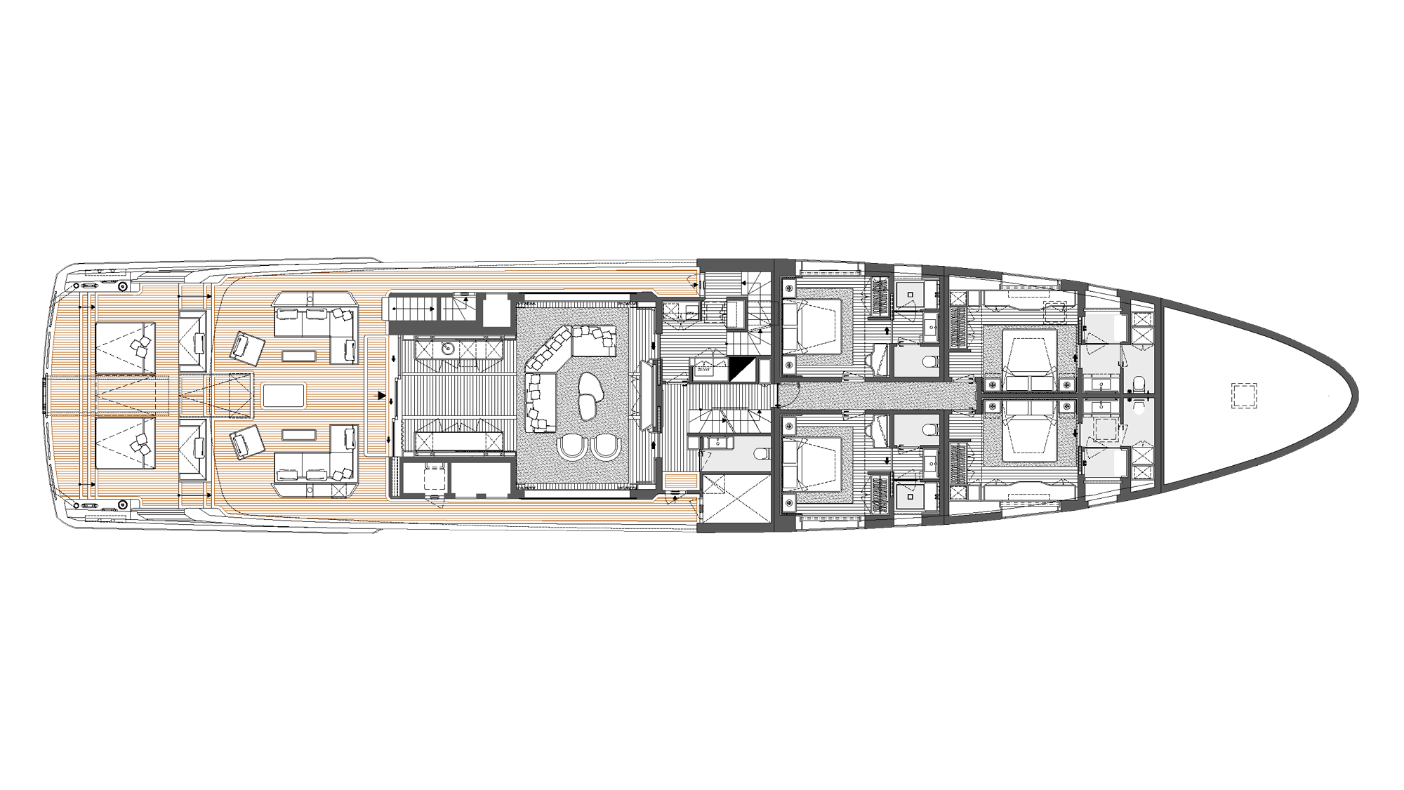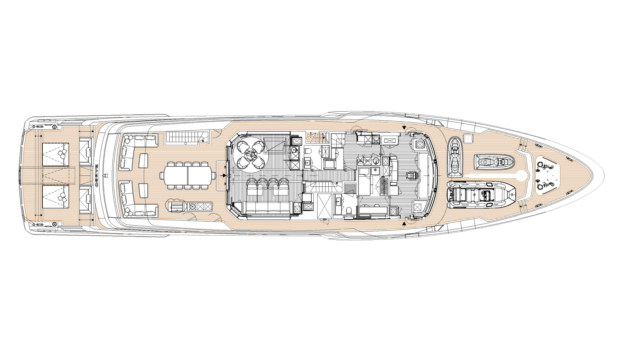 Guests are accommodated in four equally seized suites on the forward section of the Main deck and two twin cabins on the Lower deck. The Lower deck also houses generously sized galley, crew mess, and laundry facilities. Crew accommodations consists of four cabins on the forward section of the Lower deck, while the Captain enjoys a dedicated suite adjacent the wheelhouse. Tenders and toys are conveniently stored in a compartment on the forward section of the Upper deck.